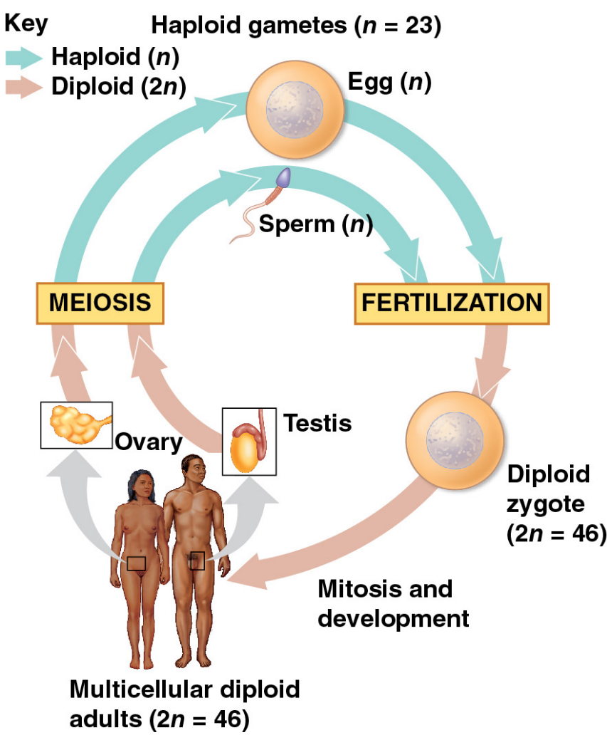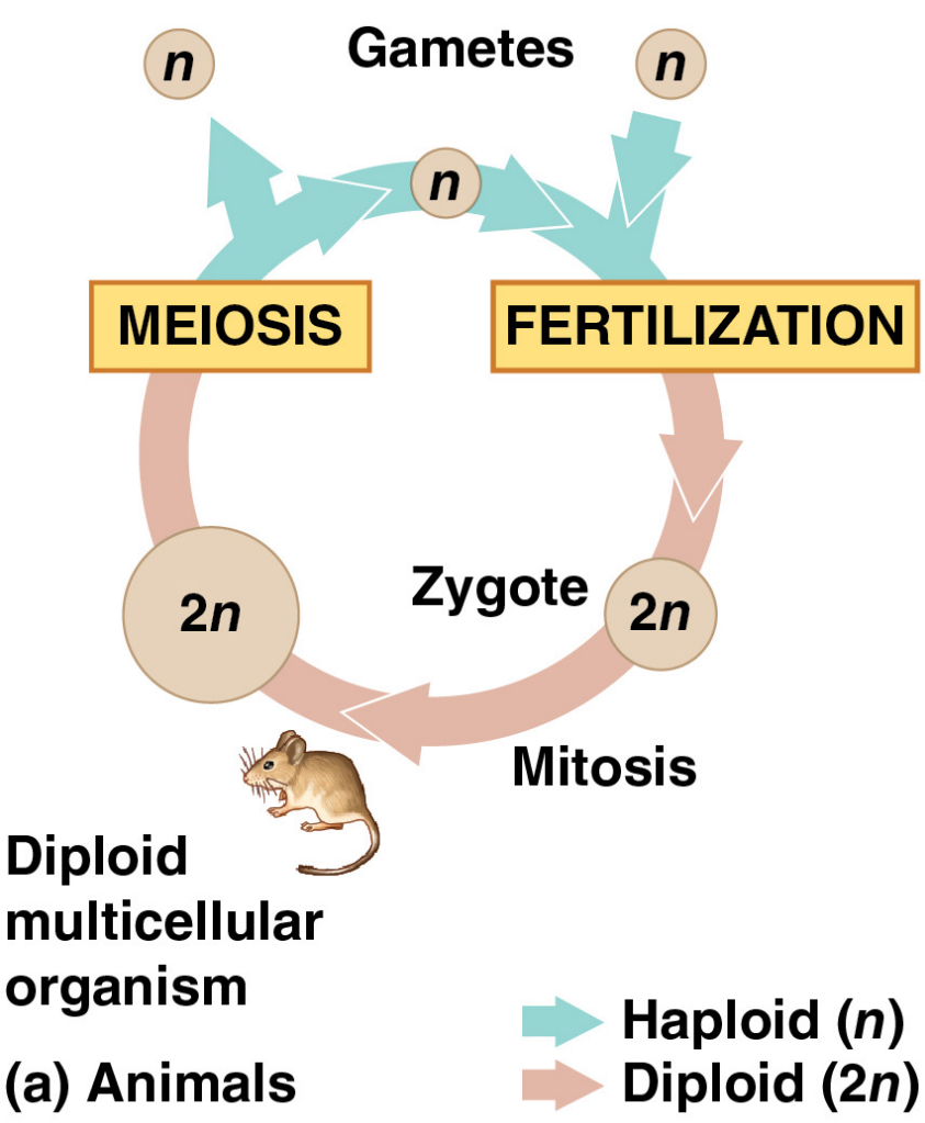 대부분의 동물에서 gametes는 haploid이다. gametes는 meiosis에 의해 생성되며 fertilization이 일어날 때 까지 더 이상 mitosis를 하지 않는다.