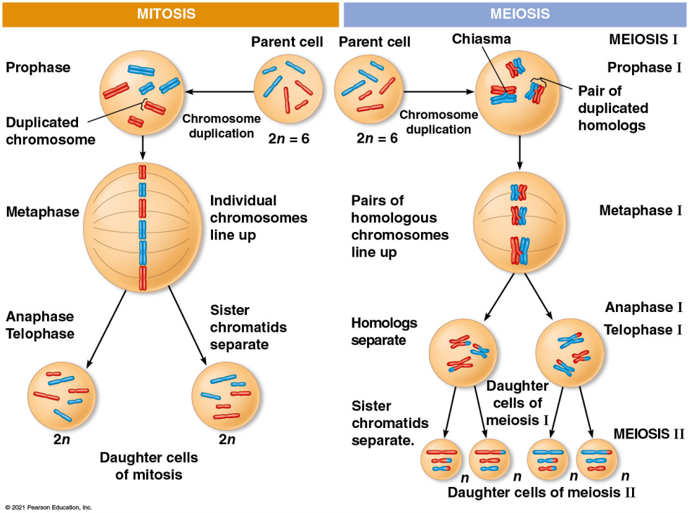 mitosis는 모세포 유전적으로 동일한 두 개의 세포를 형성하면서 chromosome set의 수를 줄인다. meiosis는 모세포 및 딸 세포끼리 유전적으로 다른 4개의 세포를 형성하면서 chromosome set의 수를 두 개에서 한 개로 줄인다. (2n n)