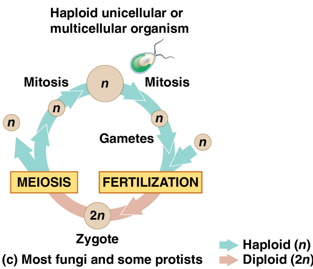 대부분의 fungi와 일부 prosist에서는 multicellular diploid stage가 없으며 유일한 diploid stage는 single celled zygote이다. zygote는 meiosis를 통해 haploid cell을 생성한다. haploid cell은 mitosis를 통해 haploid multicelluler organism을 형성한다. 성체 haploid는 mitosis를 통해 gametes를 형성한다.