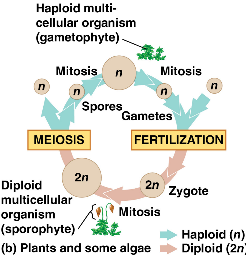 식물들과 일부 조류에서는 alternation of generatuin이 나타난다. 여기에는 diploid와 haploid multicellular stage로 이루어진다. diploid organism은 sporophyte라고 부르며 meiosis를 통해 haploid spore를 생성한다. sprore는 mitosis를 통해 gametophyte라고 불리는 haploid organism으로 성장한다. gametophyte는 다시 mitosis를 통해 haploid gamete를 생성하고 gametes 간의 수정을 통해 diploid sporophyte를 형성한다.
