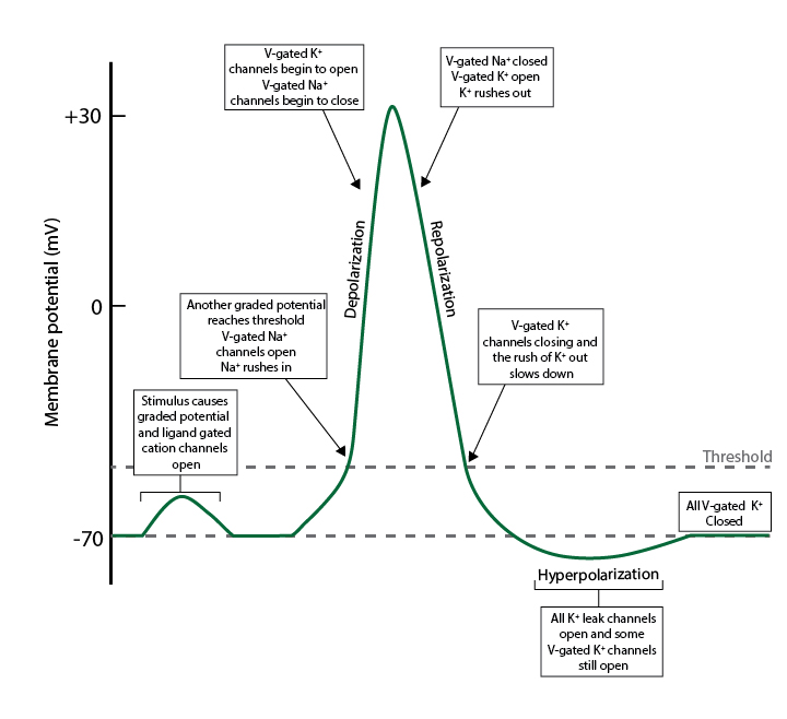차등 전위가 축삭 둔덕에 도달 했을 때, 크기가 역치 이상이라면 축삭 둔덕 내의 voltage-gated sodium channel(VGSC)이 열리고 막 전위가 상승하게 된다. 상승한 막전위로 인해 다시 주변의 VGSC가 열리며 막 전위가 급격하게 상승하게 된다. 이렇게 역치 이상의 자극이 주어졌을 때 막 전위가 급격하게 상승하는 현상을 활동 전위라고 한다.