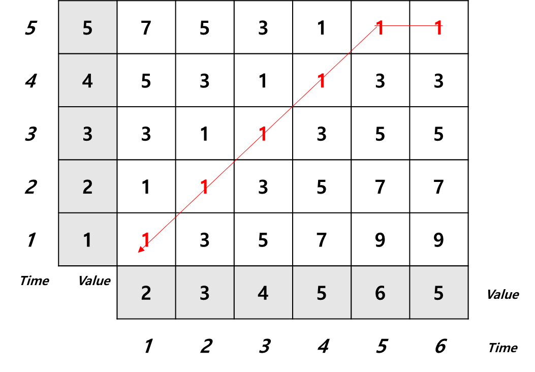 DTW는 기본적으로 다이나믹 프로그래밍 기법(문제를 여러 개의 하위 문제로 분할에서 최적해를 계산하는 방법)을 이용한다. DTW를 위해 우선 두 시계열의 시점간의 유사도를 측정하기 위한 거리 함수를 정의해야 한다. 일반적으로 Euclidean distance가 많이 활용된다. DTW에서 시점을 탐색에서는 다음의 조건을 충족시켜야한다.