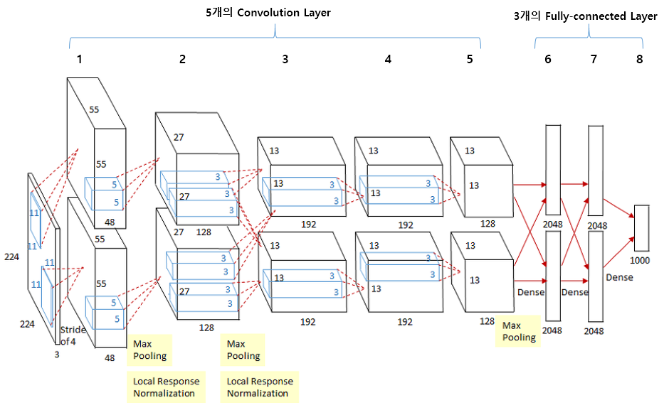 두 개의 GPU에서 독립적으로 학습시킴으로써 서로 다른 feature map을 추출하는 layer를 구성하였으며, 3번째 layer에서 convolution 결과를 concat 해주었으며 해당 layer에서는 convolution만 수행하였다.