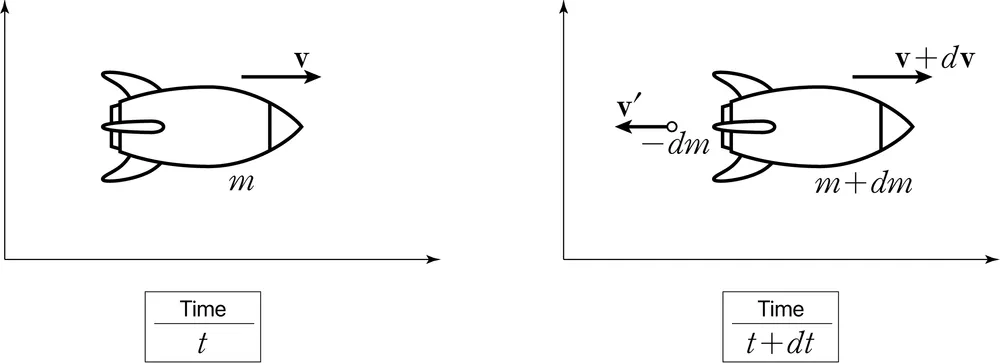 ::\begin{align} & v_{f}=v_{i}+uln\left( \frac{m_{i}}{m_{f}} \right) \\ & ma=Rv_{rel} \\ & \text{시각 } t \text{에서 질량이 } m \text{인 로켓의 속도를 } v \text{라 하자. 시각 } t + dt \text{에서 연료가 분출된 후 로켓의 질량이 } m + dm \text{(단, 질량이 줄어드는 상황이므로 } dm < 0\text{)으로 변했다면, 분출된 연료의 질량은 } -dm \text{이 된다. 연료의 분출 속도를 } v' \text{이라 하자. 또, 로켓의 속도는 } v + dv \text{로 변할 것이다.} \\ & \text{이상에서 } t \text{에서 로켓의 계의 운동량은 } mv \text{이고, } t+dt \text{에서 로켓의 운동량은 } (m+dm)(v+dv) \text{, 연료의 운동량은 } -v' \, dm \text{이다. 이는 곧 } t+dt \text{에서 로켓의 계의 운동량은} \\ & (m+dm)(v+dv) - v' \, dm \\ & \text{로켓의 계에 가해지는 외력이 없으므로 계의 운동량은 보존되어야 한다. 즉, } t, t+dt \text{에서 운동량은 같아야 하므로} \\ & mv = (m+dm)(v+dv) - v' \, dm \\ & \text{한편, 연료의 로켓에 대한 상대적인 분출 속도 } -u \equiv v' - (v+dv) \text{를 도입하면,} \\ & mv = (m+dm)(v+dv) + dm[u - (v+dv)] \\ & \text{이것을 전개하여 정리하자.} \\ & m \, dv = -u \, dm \quad (\ast) \\ & \text{변수분리를 통해 위 미분 방정식을 풀 수 있으며} \\ & dv = -\frac{u}{m} \, dm \\ & \text{에서 로켓의 초기 속도를 } v_i, \text{나중 속도를 } v_f, \text{초기 질량을 } m_i, \text{나중 질량을 } m_f \text{라 하면,} \\ & \int_{v_i}^{v_f} dv = -u \int_{m_i}^{m_f} \frac{dm}{m} \\ & \text{인데 아래와 같이 적분의 결과를 나중 속도에 대하여 정리하면,} \\ & v_f = v_i + u \ln \left(\frac{m_f}{m_i}\right) \\ & \text{참고로 식 } (\ast) \text{의 양변을 } dt \text{로 나누면} \\ & m \frac{dv}{dt} = -u \frac{dm}{dt} \end{align}